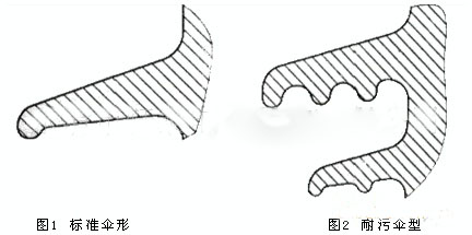 普通型絕緣子采用標準傘形(見圖1)。耐污型、耐重污型絕緣子采用經人工污穢試驗優(yōu)選的大小傘相間 、傘下帶棱的傘形( 見圖2 )。由于小傘處于大傘的保護之下不易受污染,且大傘間間距較大 ,改善了傘間放電特性,因而提高了絕緣子的耐污性能,并有利于帶電水沖洗。